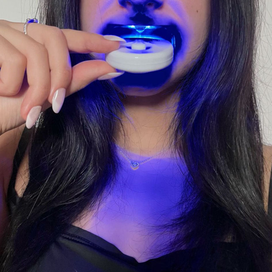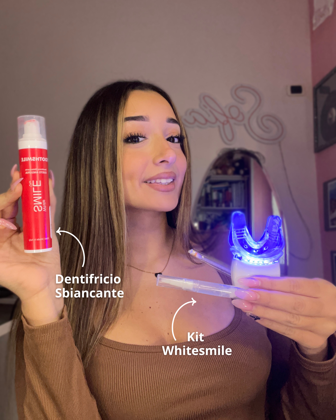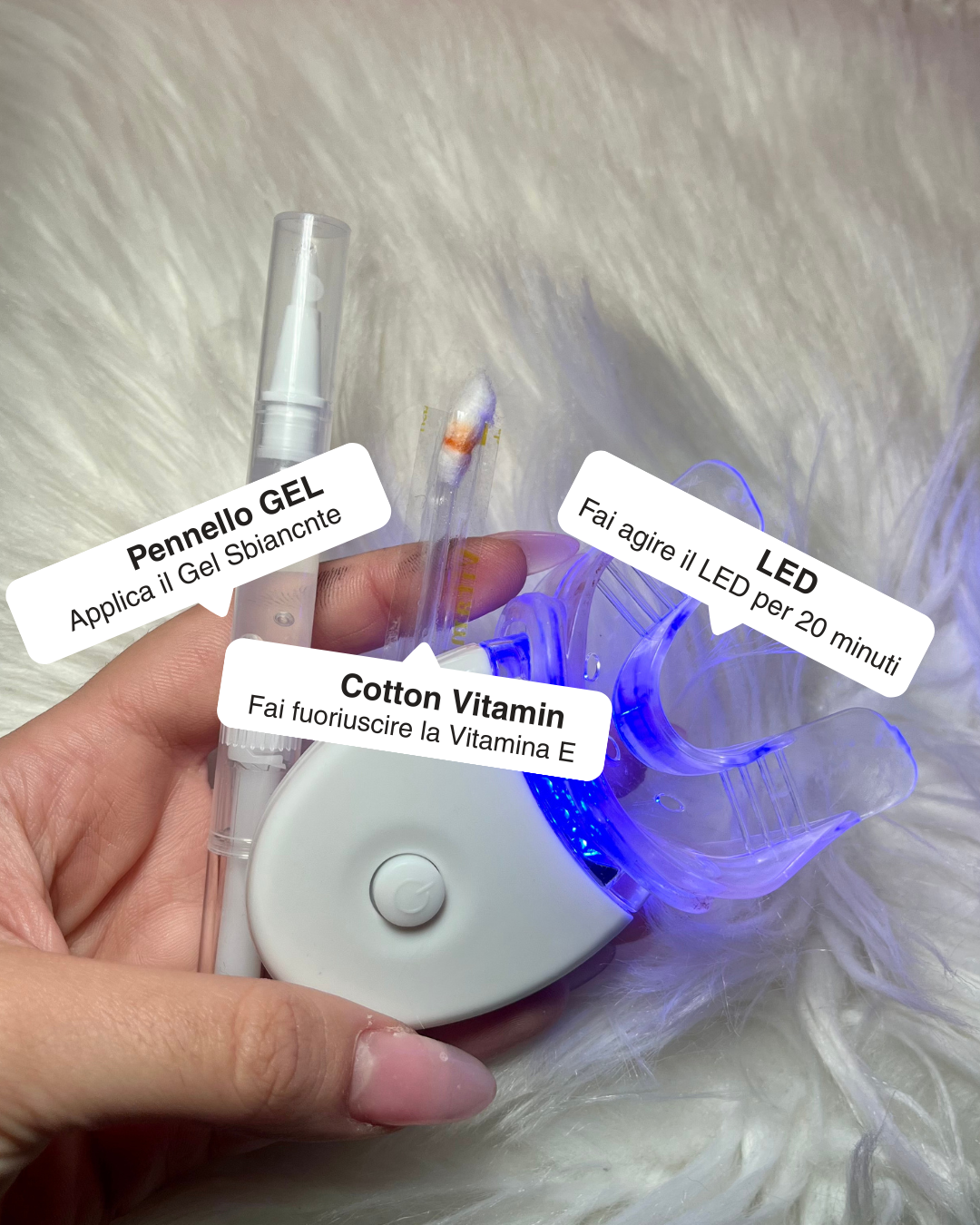 Usa prima il dentifricio sbiancante per pulire e preparare lo smalto, poi applica il kit whitesmile con cotton vitamin, gel e luce led per ottenere un sorriso più bianco in 20 minuti.